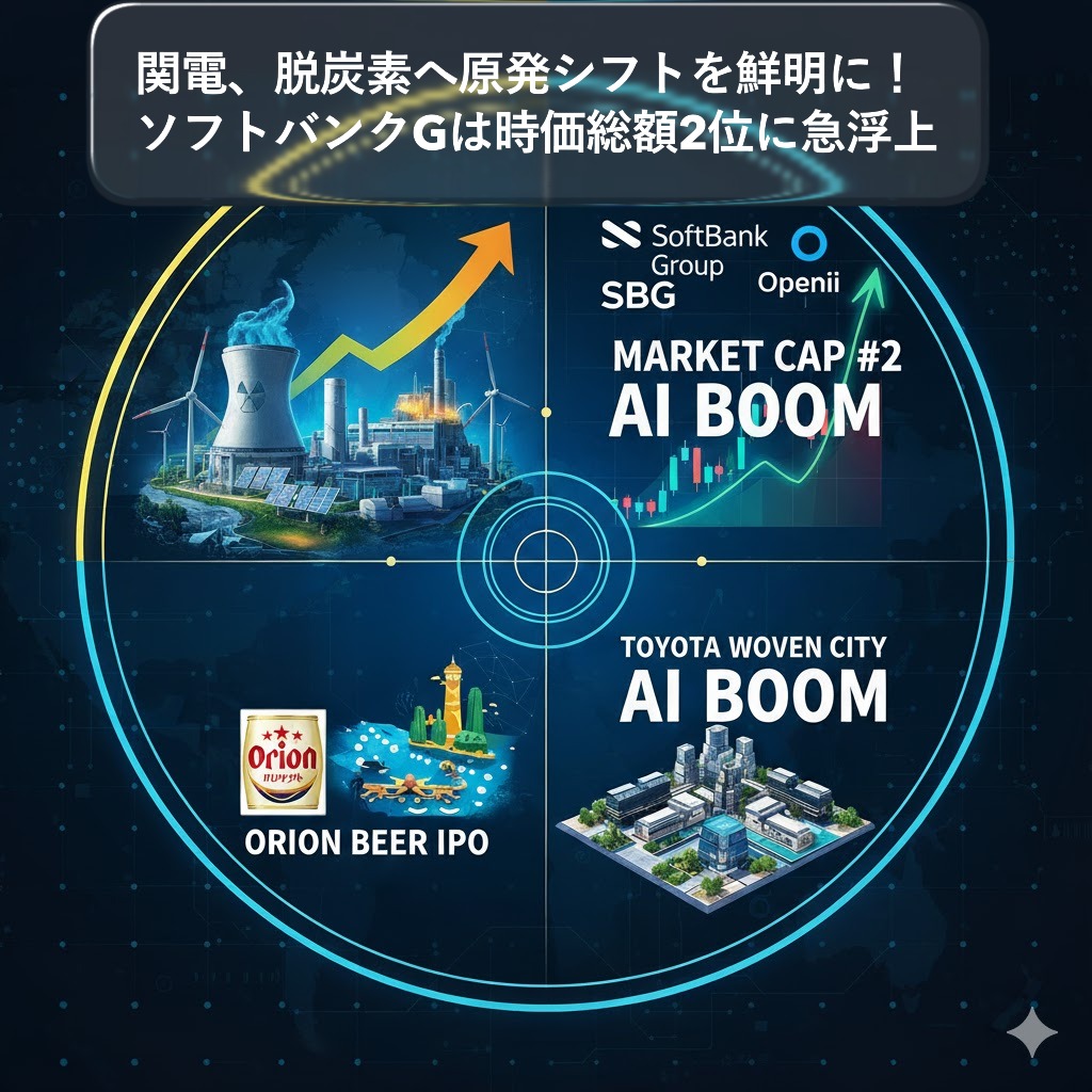 日本経済の未来を左右する二つの大きな動きが報じられました😊。関西電力は石油火力発電所の廃止を進め、脱炭素化と原発シフトを鮮明にしました。これは日本のエネルギー政策の大きな転換点となりそうです。一方、株式市場では、ソフトバンクグループ(SBG)の時価総額が国内2位に急浮上!世界的なAIブームと出資先OpenAIの評価拡大が、SBGの株価を押し上げました。その他、沖縄の製造業で初となるオリオンビールの上場や、トヨタのウーブンシティ始動など、未来に向けた様々な動きが明らかになっています。これらの最新ニュースが示す日本の産業構造の変化を詳しく解説します!