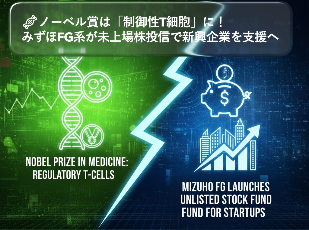 最先端の科学のニュースと、日本の未来の経済を支えるスタートアップへの資金供給に関する話題が注目を集めていますね😊。今年の「ノーベル賞の秋」が到来し、特に生理学・医学賞では、日本の研究者による「制御性T細胞」の発見という、人類の健康に不可欠な研究に光が当たりました。一方、金融界では、みずほFG系が未上場株に投資する投資信託を立ち上げ、これまでIPO(新規株式公開)に偏重していた日本のスタートアップ市場に、新たなマネーの経路を作ろうとしています。科学と金融の両面で、日本が未来に向けた布石を打つ最新の動向を詳しく解説していきます!