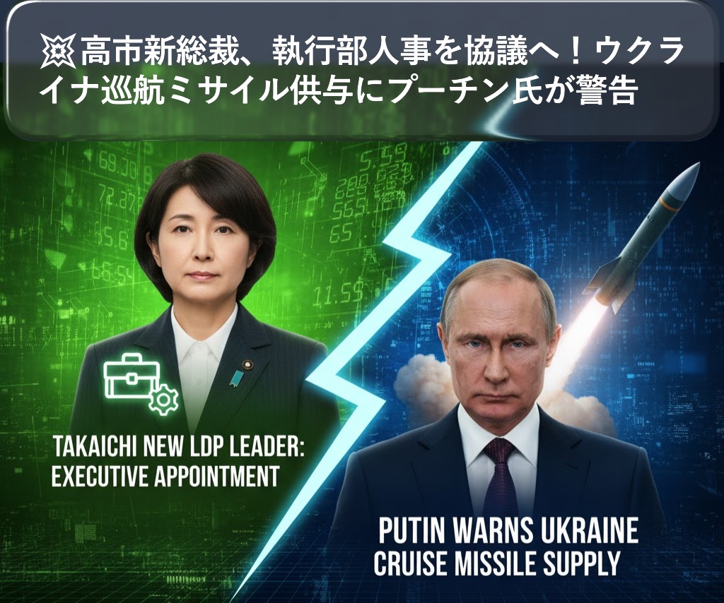 いよいよ自民党総裁選が終わり、高市早苗新総裁が誕生しました🎉!総裁選の勝利を受けて、早速、党執行部の人事について麻生最高顧問と会談するなど、新体制の動きが始まっていますね。一方で、国際情勢では、アメリカがウクライナに巡航ミサイル供与を検討していることに対し、プーチン大統領が「米ロ関係の破壊」につながると強く警告するなど、地政学的な緊張感が依然として高い状況です。国内では、ソフトバンクグループのロボット事業再編や、東京電力によるEVバスを活用したユニークなエネルギー活用策など、未来の産業を形作る重要な動きが報じられました。そして、金融市場ではビットコインが史上最高値を更新し、アメリカへの不信が資金流入を加速させています。今週の最新ニュースを詳しく解説していきます!