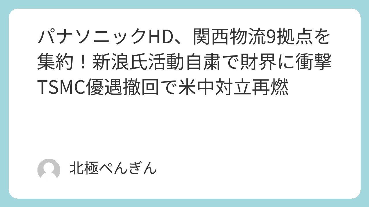 - タイトル: パナソニックHD_関西の物流9拠点を集約、新浪剛史・経済同友会代表幹事が活動自粛