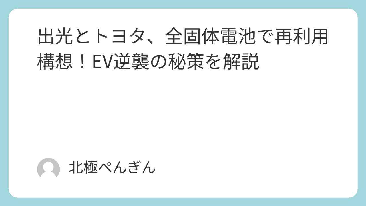 現在、電気自動車(EV)の主流であるリチウムイオン電池に代わり、次世代電池として期待されているのが「全固体電池」です。しかし、普及に向けた最大の壁は、そのコストの高さでした😟。今回、石油元売りの出光とトヨタ自動車がタッグを組み、このコスト課題を「電池の再利用」という革新的な仕組みで解決しようとしています。この提携は、中国勢がリードするEV電池市場で、日本勢が「逆襲の切り札」を実用化するための秘策となるのでしょうか?今回の配信では、この全固体電池の最新動向と、コスト削減に向けた具体的な構想を深掘り!この記事を読めば、EV時代の技術トレンドと日本の戦略がスッキリわかりますよ👍。