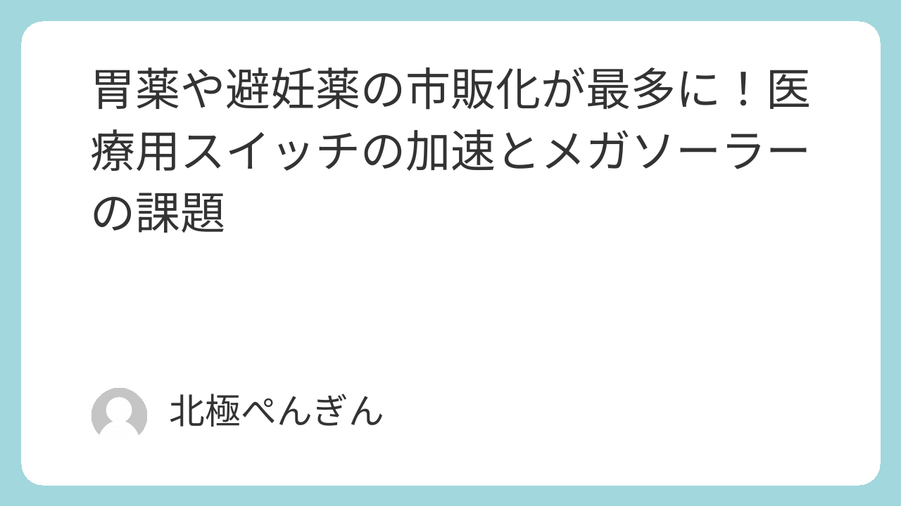 - タイトル:胃薬や避妊薬…医療用の市販へのスイッチ、メガソーラー建設 環境調和に自治体苦心