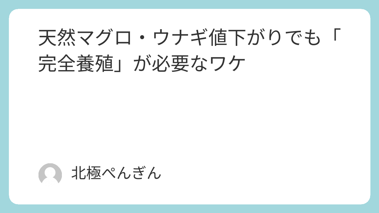 完全養殖の技術においても、採算性を無視して天然資源の保護を優先することはできませんが、マグロやウナギの完全養殖が「作りたくても作れない」状況に陥っているのは、単なるコスト高だけでなく、市場を国内に限定しすぎるといった、構造的な発想の限界も影響している可能性があります。