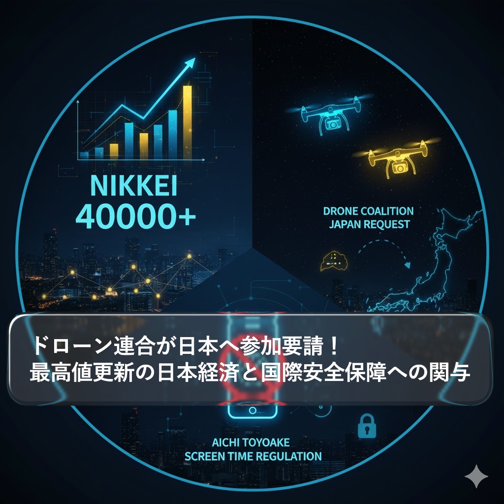 今週は、地政学的リスクと日本経済の活況、そしてデジタル社会のルール作りに関する大きなニュースが目立ちましたね😊。特に、日経平均株価が史上最高値を再び更新したという景気の明るいニュースがある一方で、バルト三国の一つであるラトビアがウクライナ支援のための「ドローン連合」に日本の参加を促すなど、国際的な安全保障への関与が強く求められています。技術が進化する中、愛知県豊昭市では全国初となるスマホ利用時間を規制する条例が成立するなど、社会的な規制の動きも加速しています。これらの最新の動向について、国際社会からの期待と国内の活況を対比させながら、詳しく解説していきます!