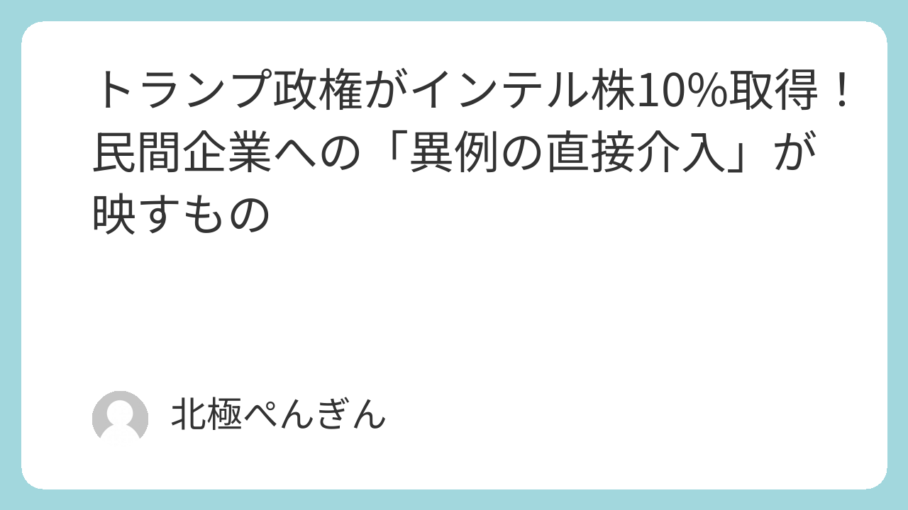 - タイトル:トランプ政権、半導体インテル株10%取得。民間企業へ異例の直接介入