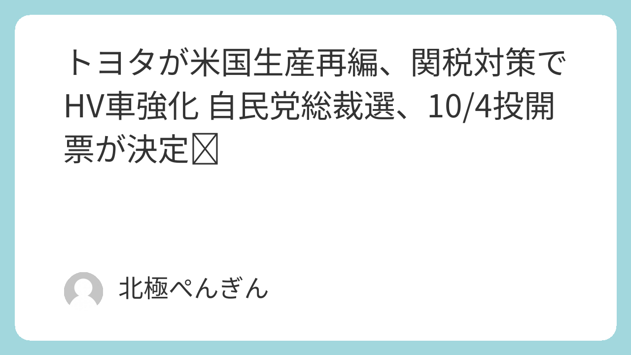 - タイトル: トヨタが米国で生産再編、自民党総裁選_22日告示―10月4日投開票