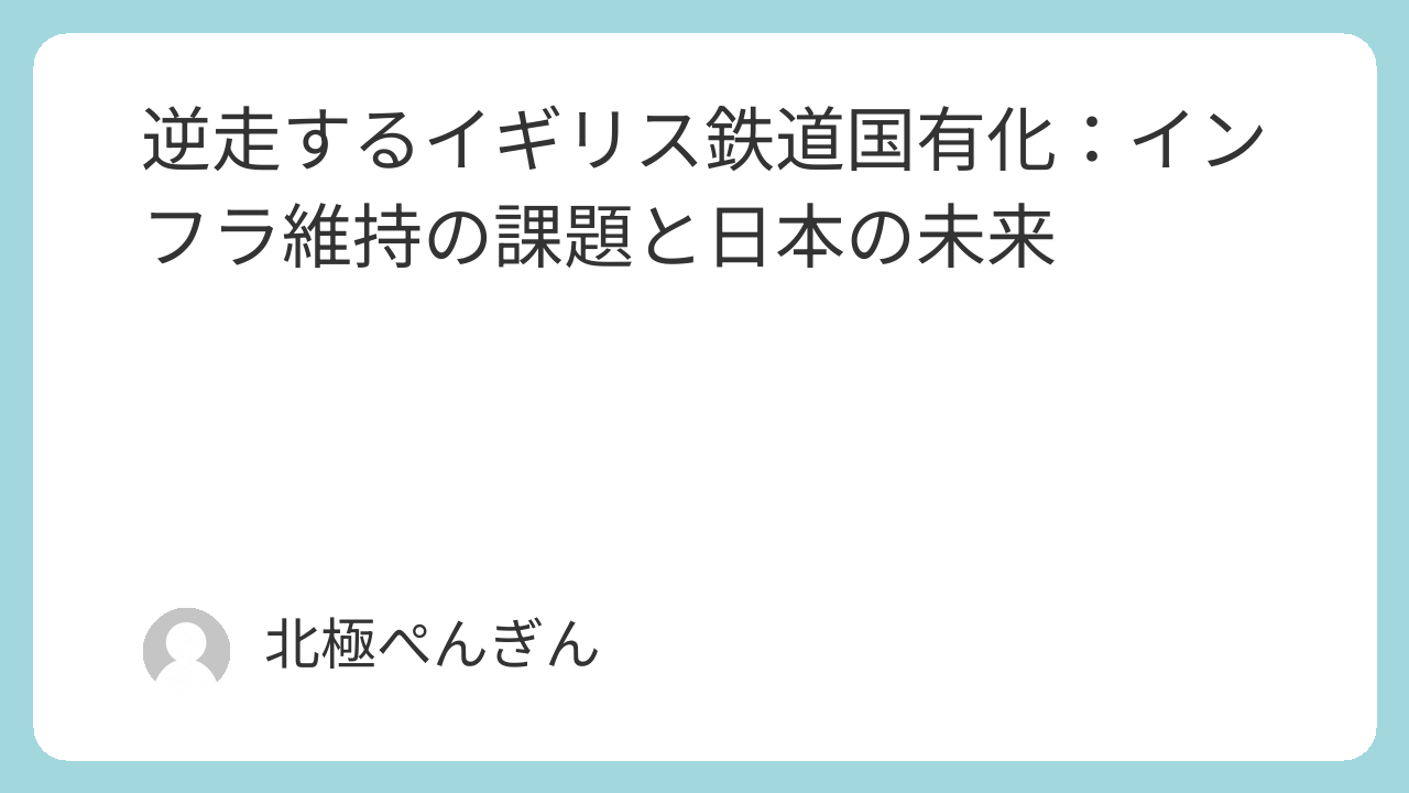 民営化失敗の構造的な理由、鉄道以外にも広がる国有化の動き、そして、イギリスの事例が、人口減少・高齢化が進む日本社会のインフラ維持(特に鉄道インフラ)にどのような教訓をもたらすのかを深掘りします。