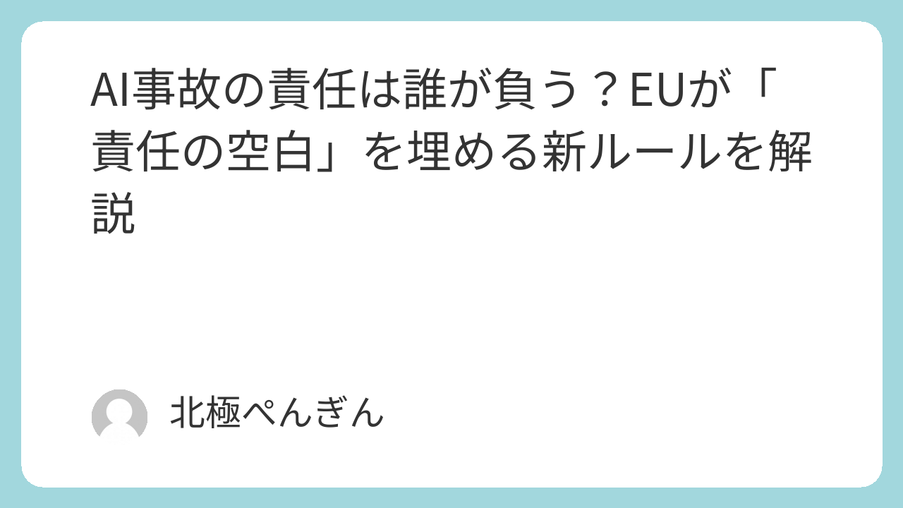 - タイトル:AI事故の責任はEUが企業の被害者保障へ申請度