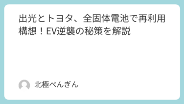 全固体電池のコスト課題に対し、出光とトヨタが「電池の再利用」で挑む戦略を解説。石油元売りの参入背景や、中国勢がリードするEV市場における日本勢の勝機を深掘りします。